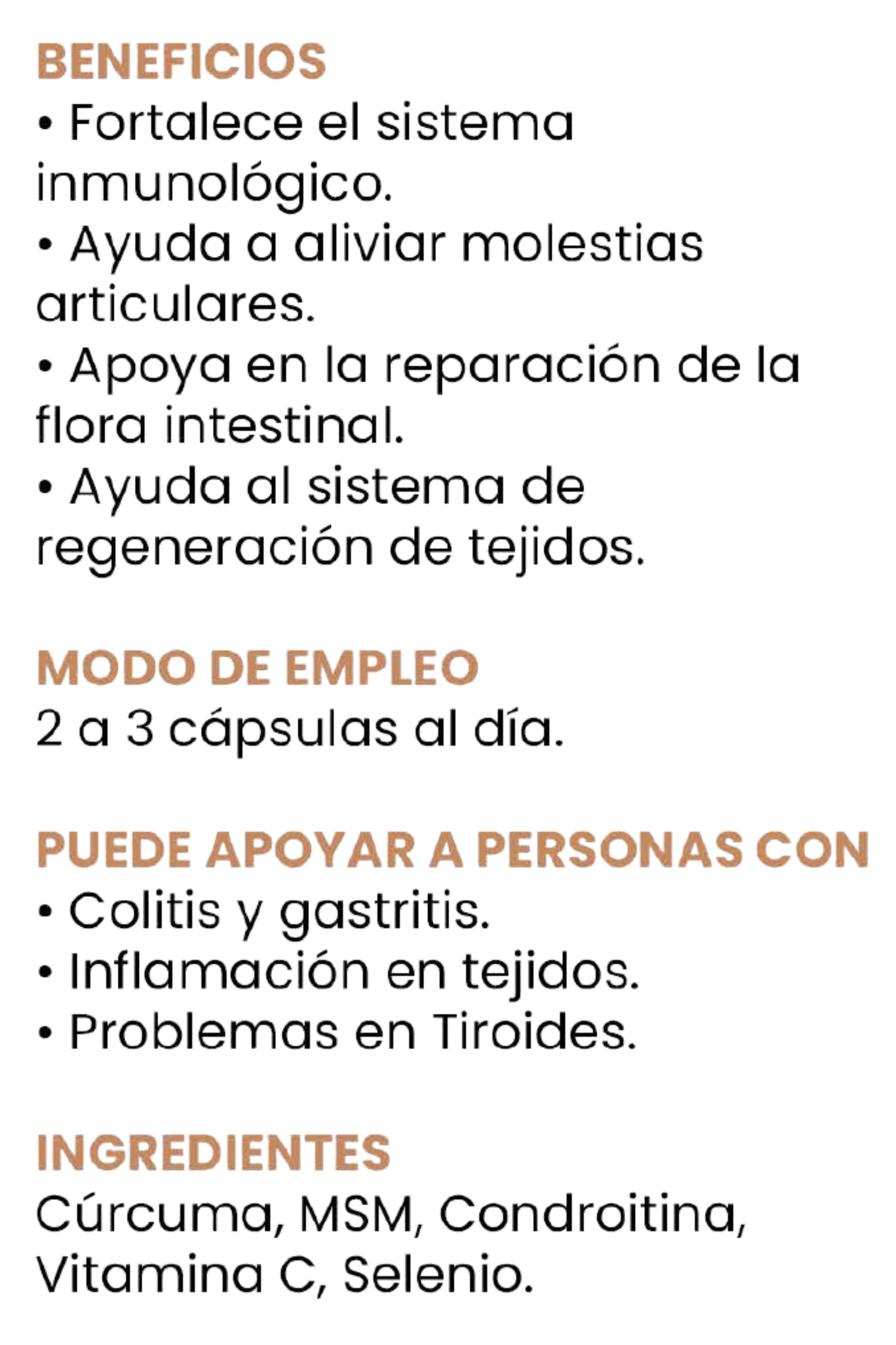 Our advanced formula combines natural ingredients such as Turmeric (Curcuma Longa), MSM, Vitamin C, and Selenium, which work together to support joint health, reduce inflammation, strengthen the immune system, and protect cells from oxidative damage. Ensuring optimal absorption and providing comprehensive benefits for overall well-being and joint mobility.