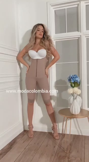 Faja Levantacola a la rodilla de alta compresión y con control en la cintura. Aplana abdomen alto y bajo. Manga Sisa con tiras removibles y ajustables. Corrige Postura. Viene con un nivel de broches + cierre frontal y en la parte íntima.