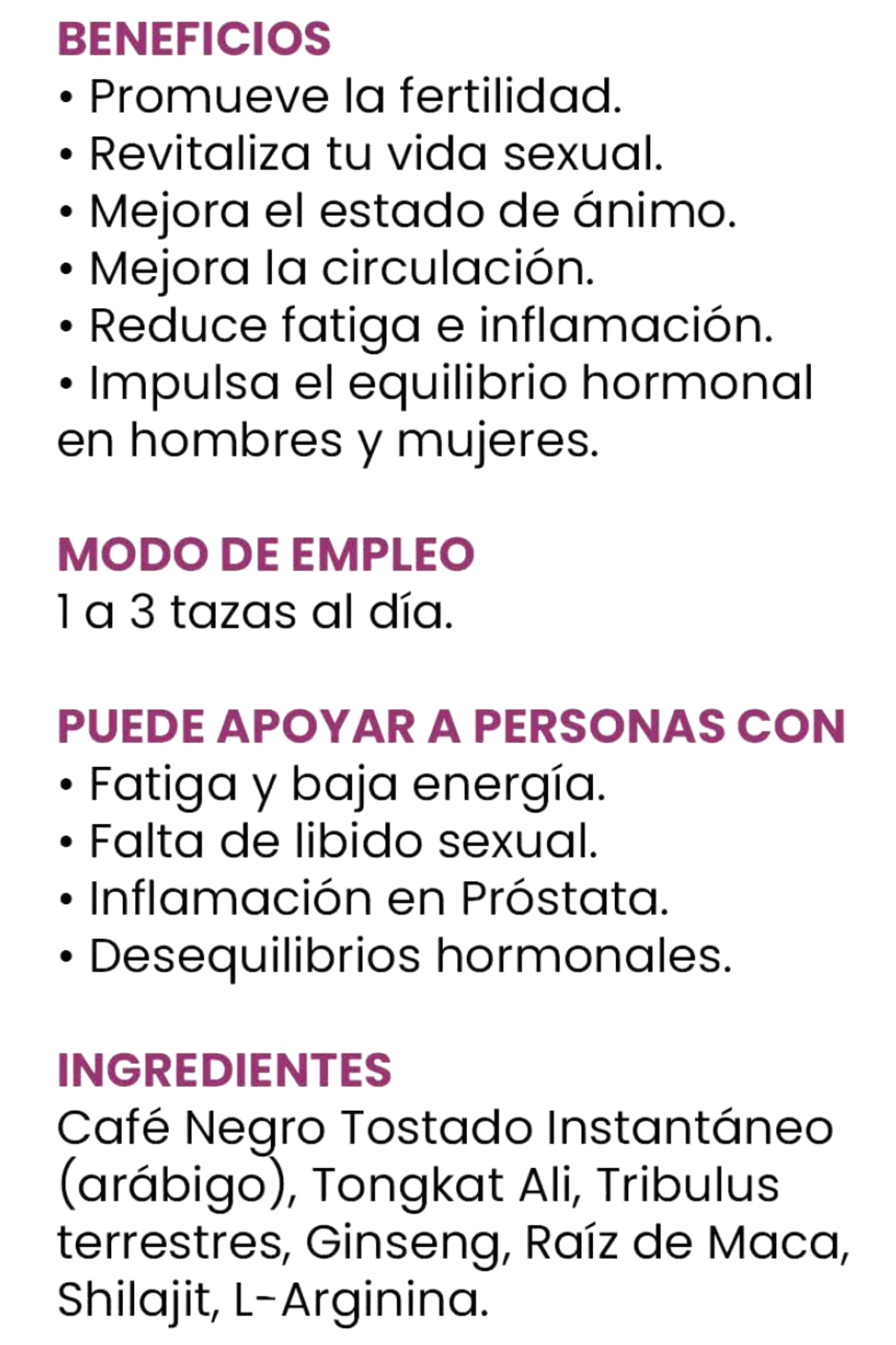INGREDIENTS: Instant dark roast coffee (Coffea arabica), Tribulus fruit extract (Tribulus terrestris), Tongkat ali root extract (Eurycoma longifolia), Himalayan shilajit extract (Asphaltum punjabianum), Panax ginseng root extract (Panax ginseng).