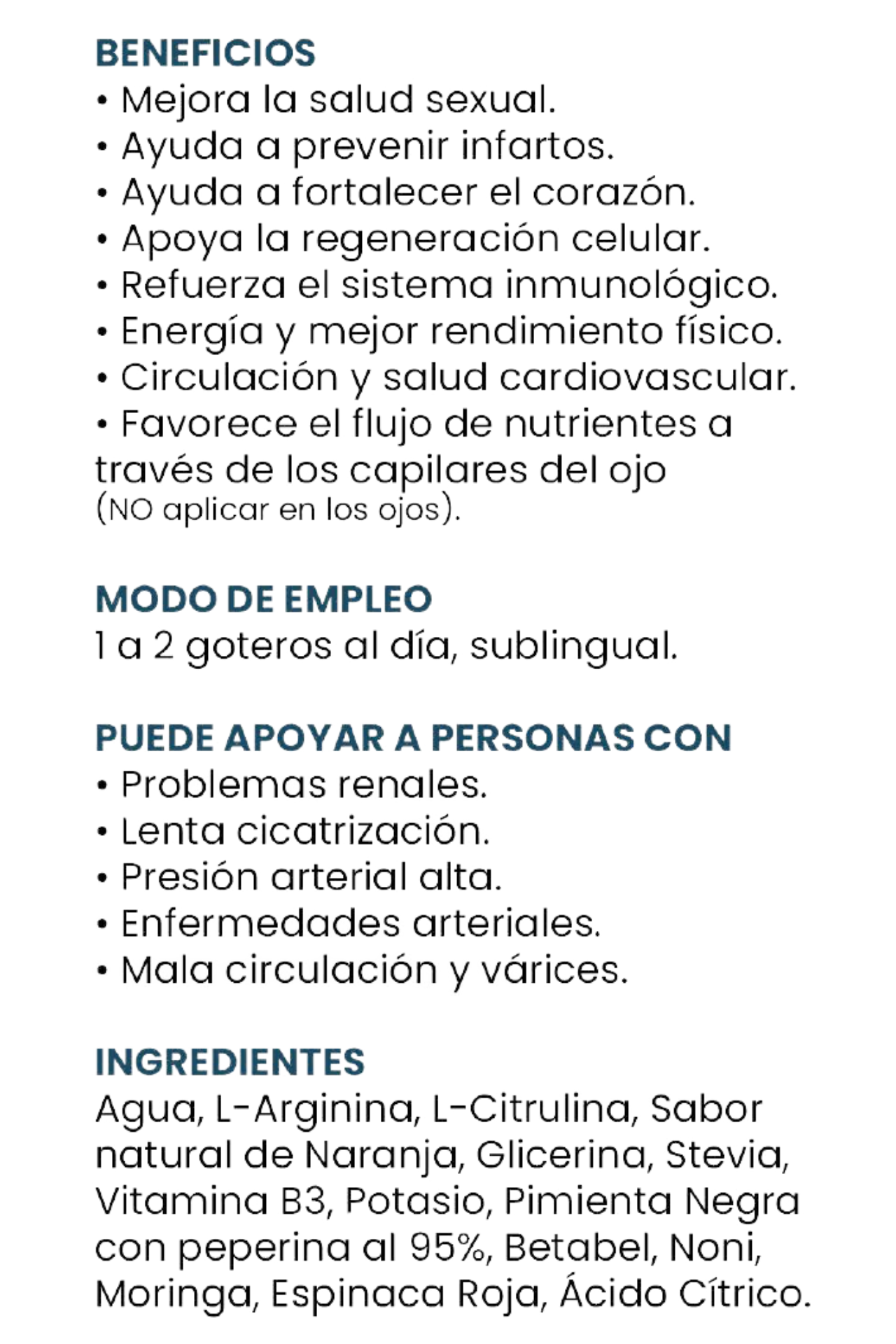 INGREDIENTES: Agua, L-arginina, L-citrulina, aroma natural de naranja, glicerina, niacinamida (vitamina B3), potasio, pimienta negra (Piper nigrum) con un 95% de piperina, remolacha (Beta vulgaris), noni (Morinda citrifolia), moringa (Moringa oleifera), espinaca roja (Amaranthus spp.), ácido cítrico, sorbato de potasio, benzoato de potasio y estevia como edulcorante.