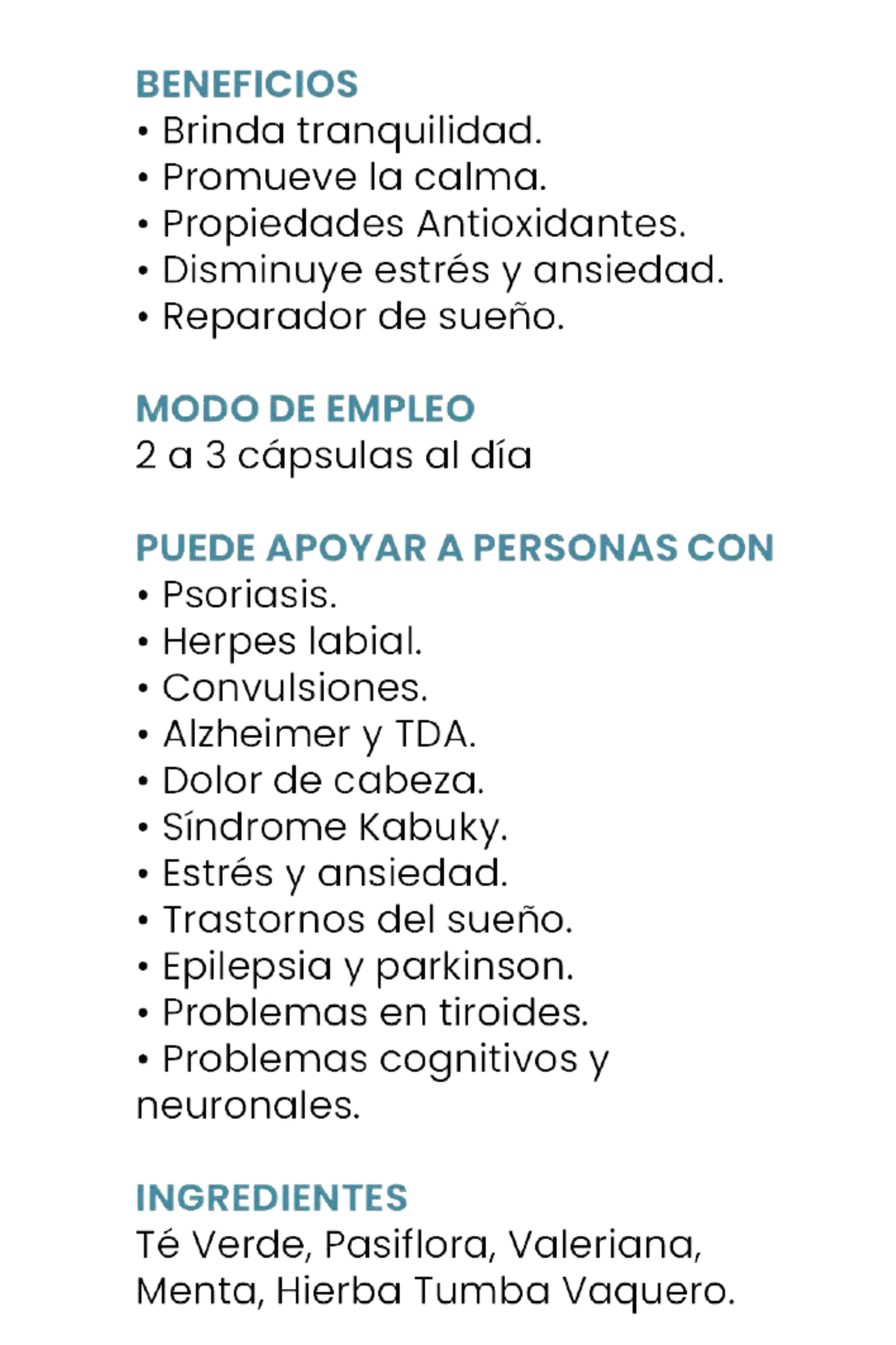 INGREDIENTS: Green tea, passionflower, valerian, mint, Tumba Vaquero.