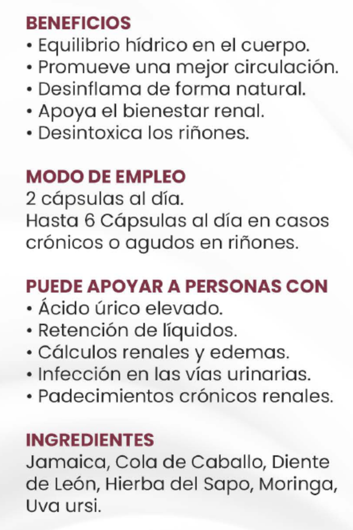 INGREDIENTS: Jamaica grass powder (Hibiscus sabdarifa), Horsetail plant powder (Equisetum arvense), Dandelion root extract (Taraxacum officinale), Toad grass extract (Eryngium heterophyllum), Moringa leaf extract (Moringa oleifera), Uva ursi leaf extract (Arctostaphylos uva-ursi). OTHER INGREDIENTS: Gelatin capsule (gelatin and water) and Silica.